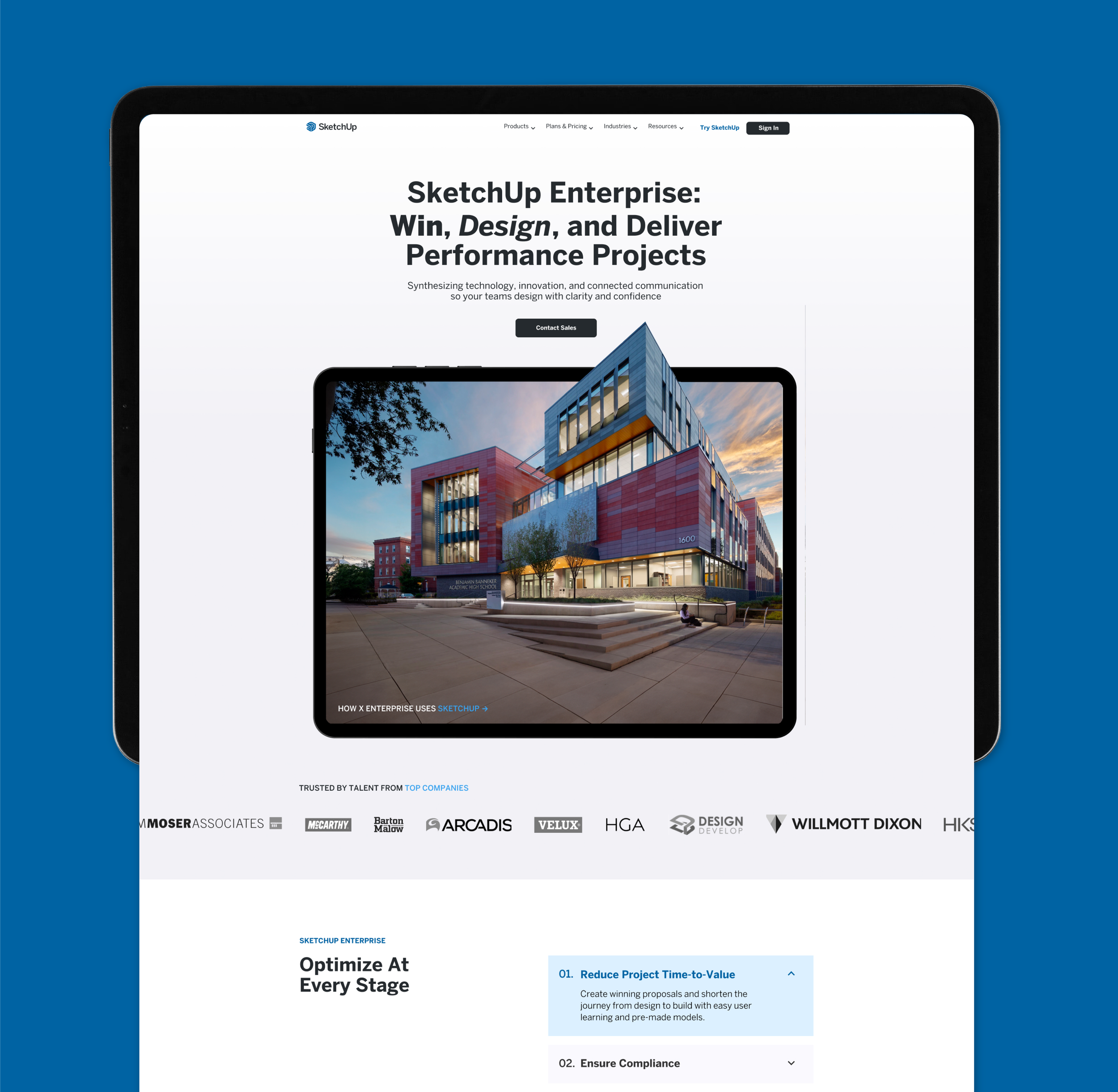 SketchUp reached out to Olivine to strengthen and enhance strategic and tactical aspects of its product marketing and increase market share. Rather than an outside consultant, the Olivine team oriented itself as a core part of SketchUp’s Product Marketing team. Efforts centered on clarifying ICPs and personas, refining positioning and messaging, up-leveling copy on select website pages, and competitive research.